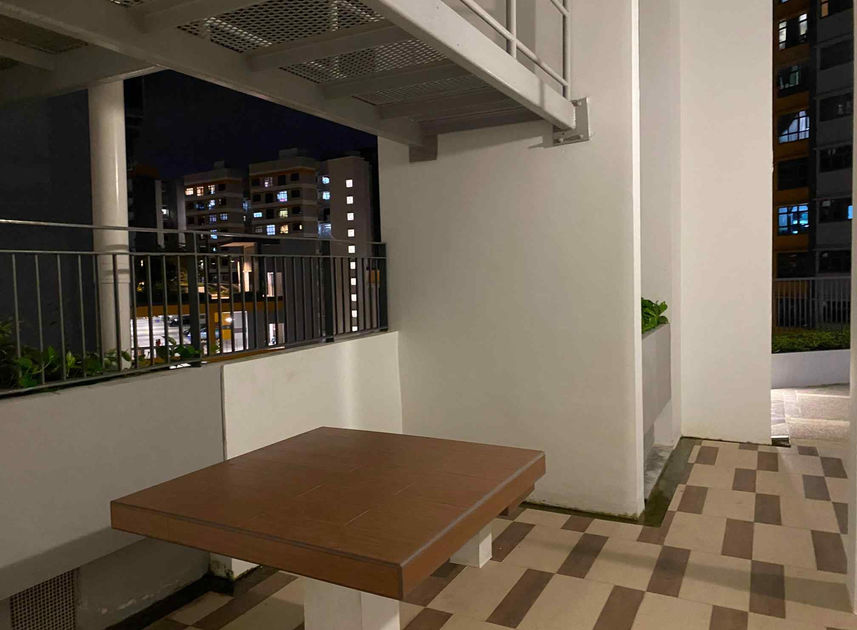 the hdb linkway is just across the block, it has 2 stone tables and a beach chair u can lie on.