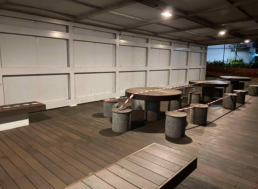 amenities: a cluster of benches and dining tables (closed due to covid), small sized gathering spaces, 💒 a small stone pathway