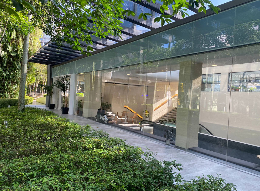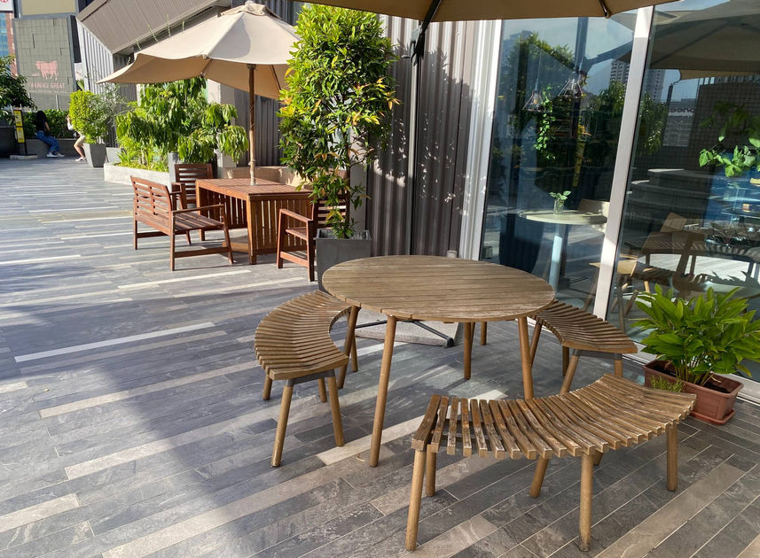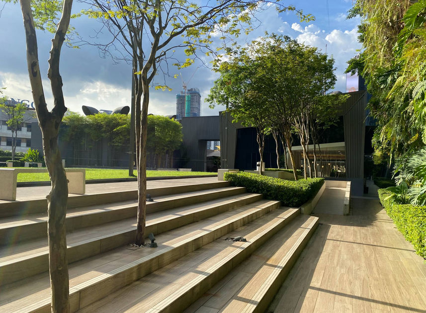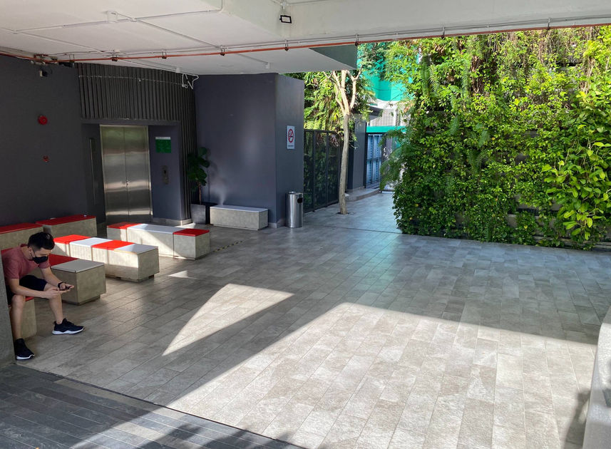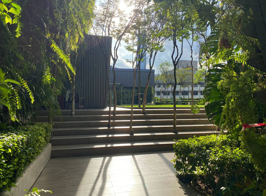amenities: a cafe and a gym. spacious grass patch, stone benches, even a swing! 🎉 dining tables have, but are part of the cafe.